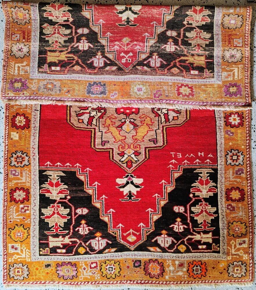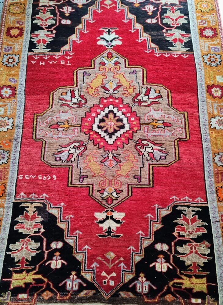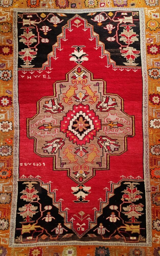 Tappeto Anatolico antico, Koniya, con disegno floreale stilizzato con in bellissimo medaglione centrale, e tinte naturali, realizzato di trama e ordito e vello in lana perciò tappeto è molto leggero, Tappeto è firmato e datato .