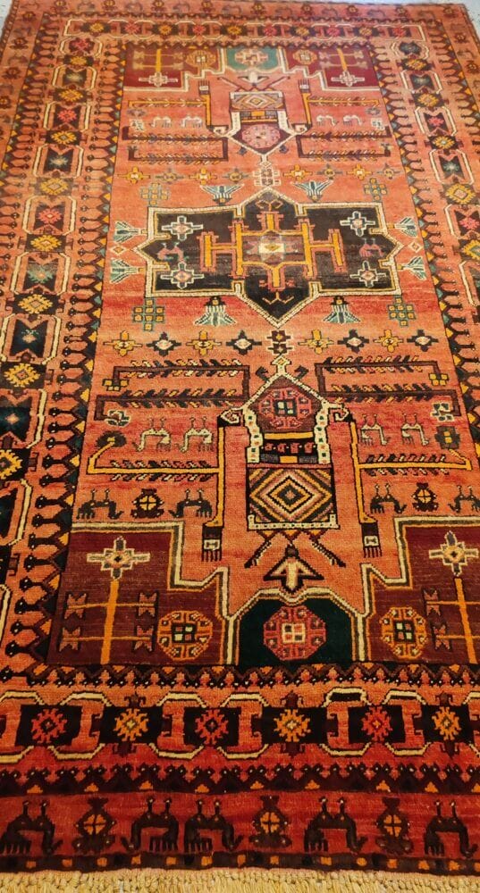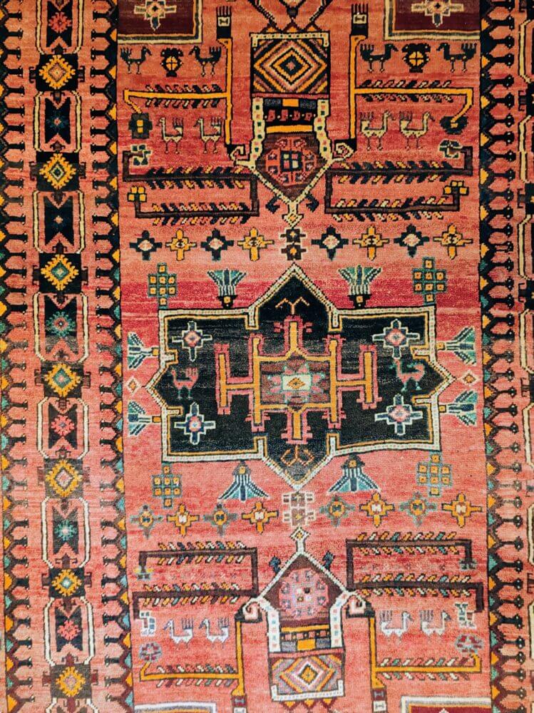Tappeto Persiano Kurdi, tinte naturali, 100 % in lana, disegno geometrico stilizzato , colore fondo salmone.