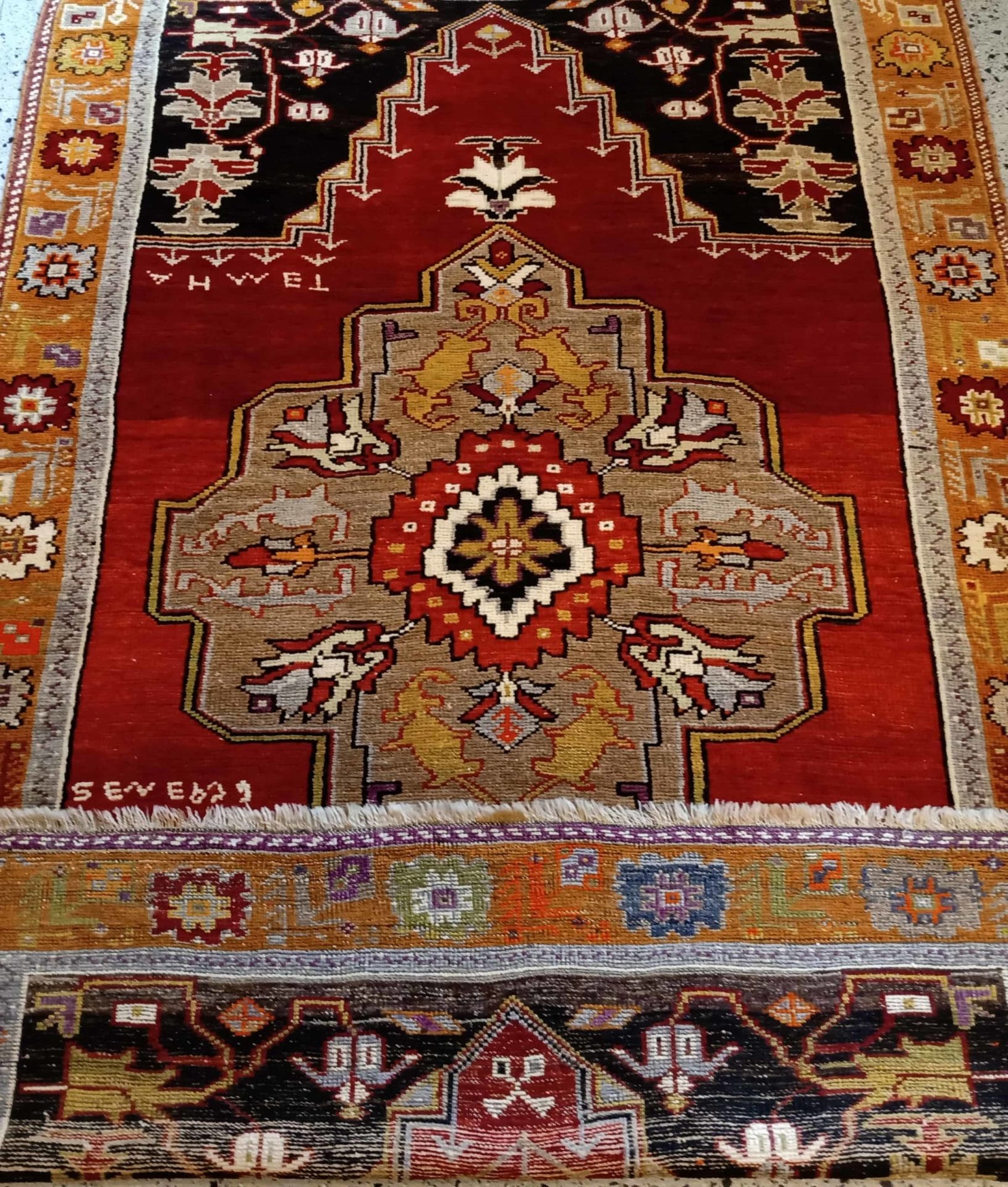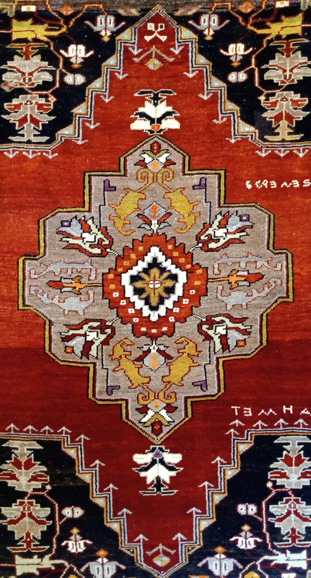 Tappeto Anatolico antico Koniya, datato e firmato, con un medaglione centrale molto elaborato, tinte naturali con colori vivaci, disegno floreale stilizzato molto elegante.