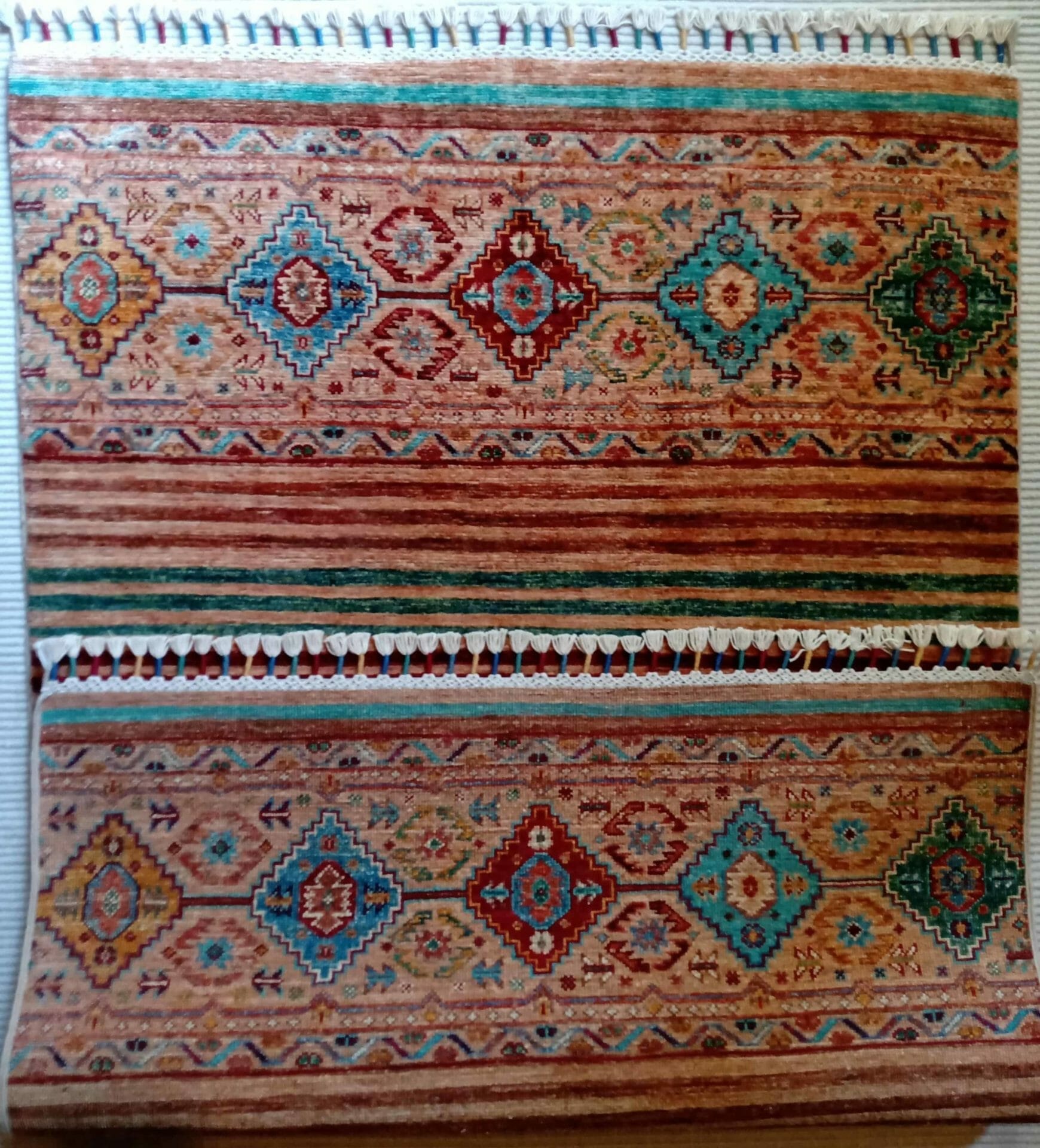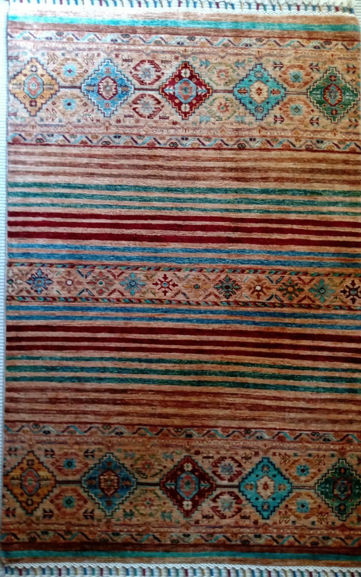 Tappeto Gabbeh, manifattura extra fine, produzione Afghana, eseguito da maestri persiani immigrati in Afghanistan, colori naturali pastello molto piacevoli, disegno moderno a strisce e rombi, perciò adattabile anche in un ambiente moderno.