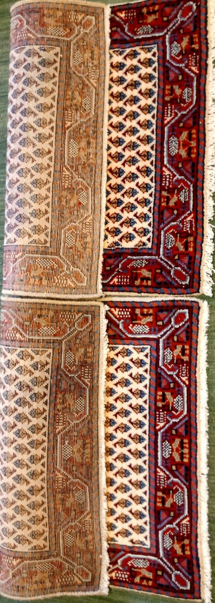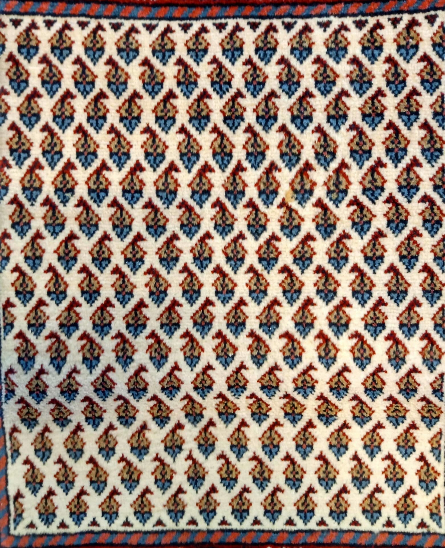 Tappeto persiano Mahal (coppia scendiletto), con disegno “boteh” ( che significa goccia) a campo libero ( senza medaglione centrale) colore di fondo chiaro con cornice molto elaborata.